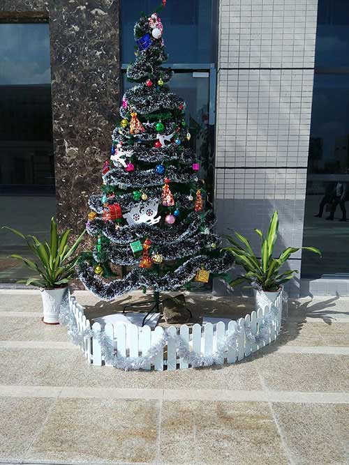 从早上开始,行政部与人事部的同事一起布置起了环境,他们用圣诞树、圣诞帽、雪花片、各种贺卡、彩灯、彩条等等,把行政楼门口的雪松装扮得流光溢彩,一片火树银花,俨然成了一个童话的世界,大家在亲手动手装扮的过程中获得情感的体验,能力的提升。