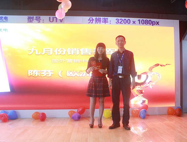 9月销售季军是来自欧洲区陈芬,她的直接领导人及欧洲区负责人joy上台代领,现场中joy对陈芬进行了高度赞赏和认可:“她是一个务实,自信,努力的女孩,在我们组中是学习的榜样”